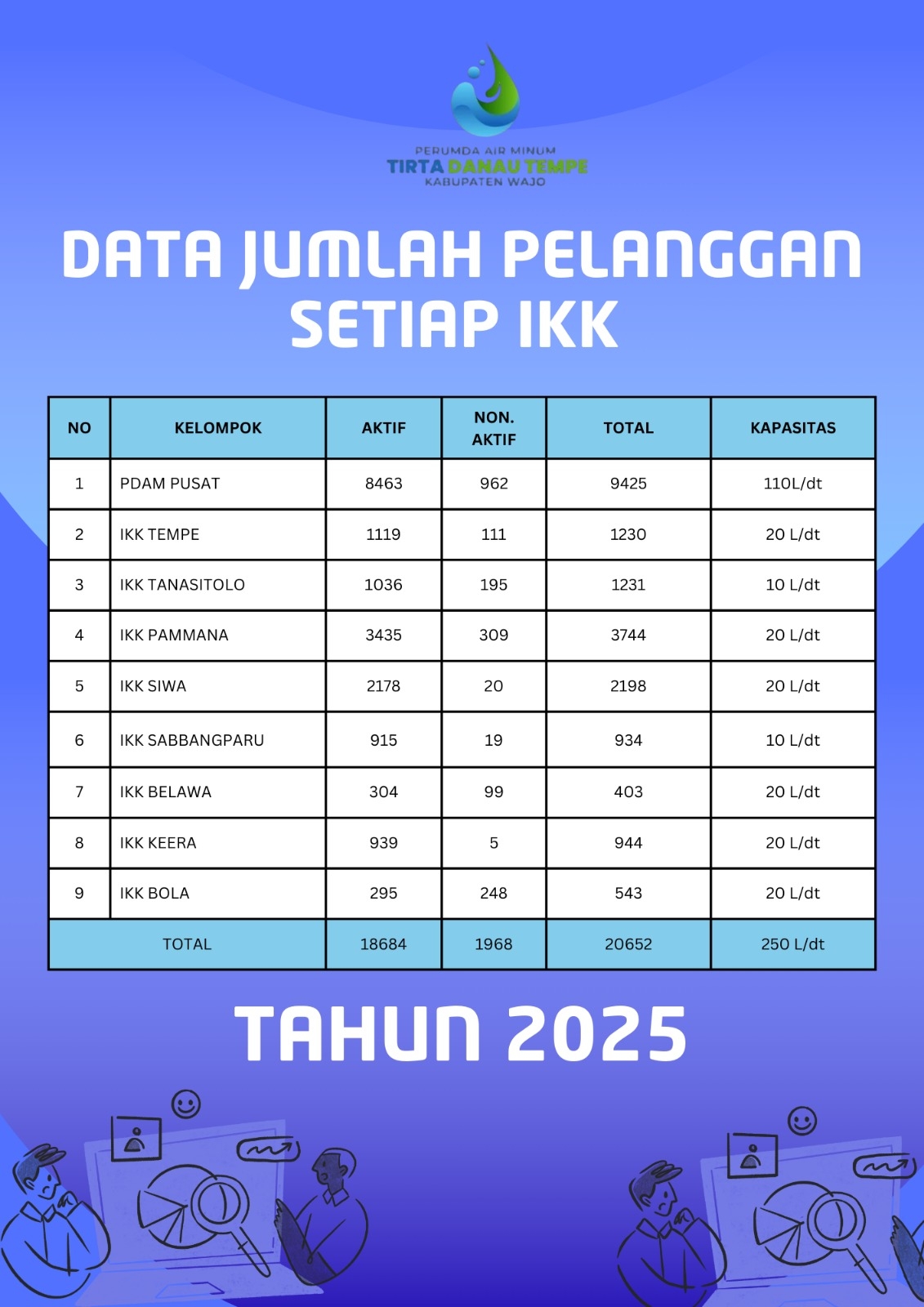 Data Jumlah Pelanggan Perusahaan umum Daerah Air Minum Tirta Danau Tempe Kabupaten Wajo Tahun 2025 total 20.652 Sambungan Rumah (SR). terdiri dari pelanggan aktif 18.684 SR dan pelanggan non aktif 1.968 SR.